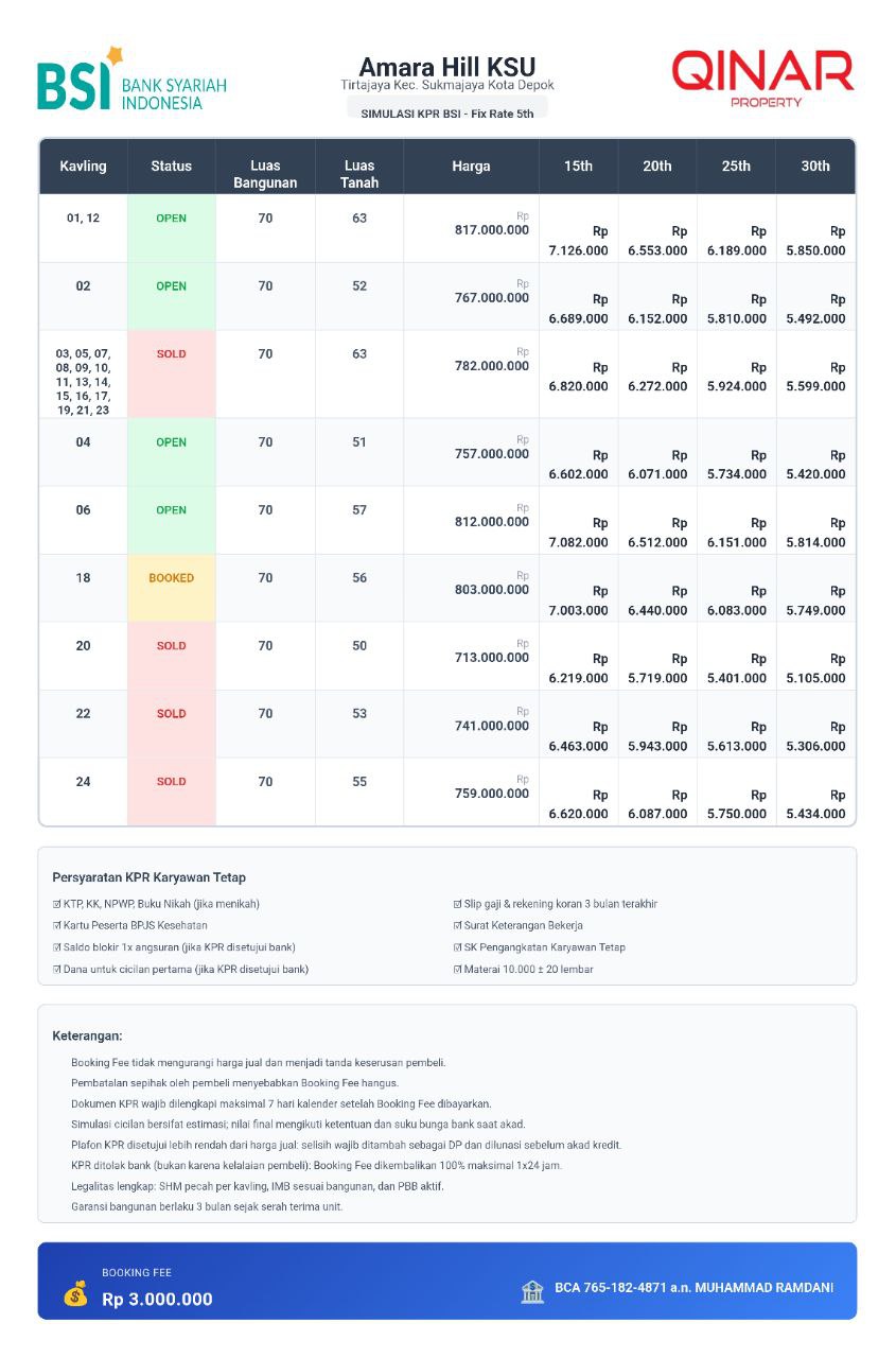 Kami juga memastikan legalitas properti di Cluster Amara Hill terjamin, sehingga Anda dapat berinvestasi dengan tenang. Dengan berbagai skema pembayaran yang fleksibel, seperti KPR dengan DP 0%, cash keras, atau cash bertahap, Anda dapat memilih cara pembelian yang paling sesuai dengan kebutuhan.