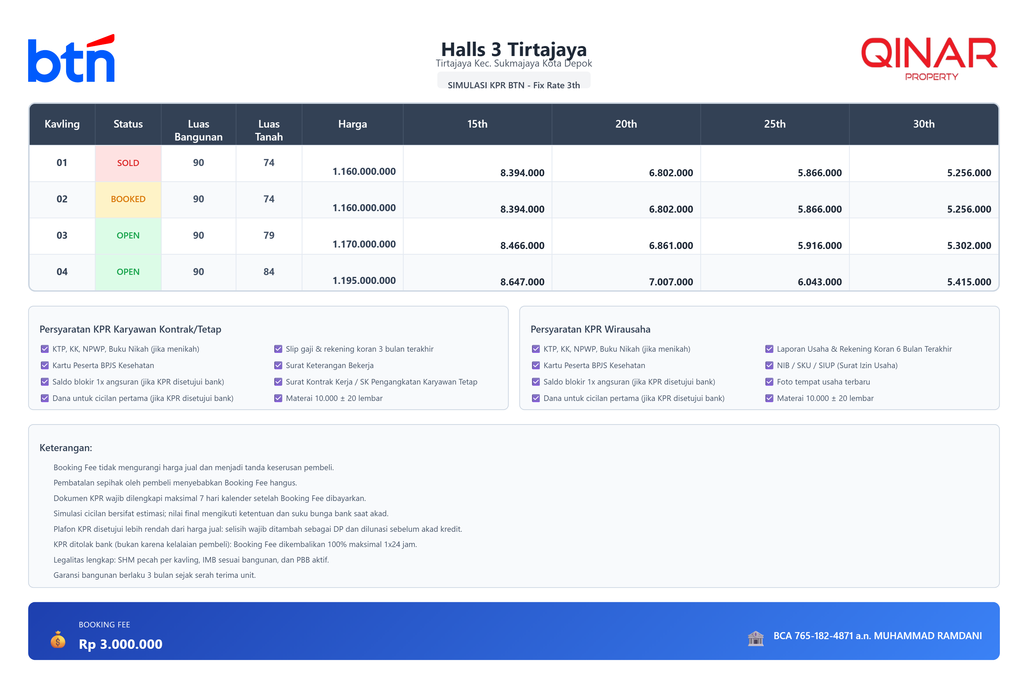 Jangan lewatkan kesempatan memiliki hunian impian di Halls 3 Tirtajaya, dengan harga hanya Rp 1.160.000.000! Nikmati kenyamanan 3KT/3KM di lokasi strategis dekat stasiun, dan pilih skema pembayaran yang paling sesuai untuk Anda. Segera booking sekarang dan isi survei kami untuk mendapatkan informasi lebih lanjut!